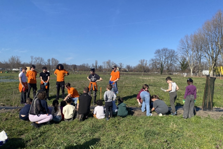Une quinzaine de jeunes en service civique au sein de Unis-Cités assurent l’encadrement du chantier et soutiennent les enfants en leur montrant les étapes à réaliser pour que l’arbre puisse grandir, on praline, on met en terre et on paille pour éviter l’évaporation.