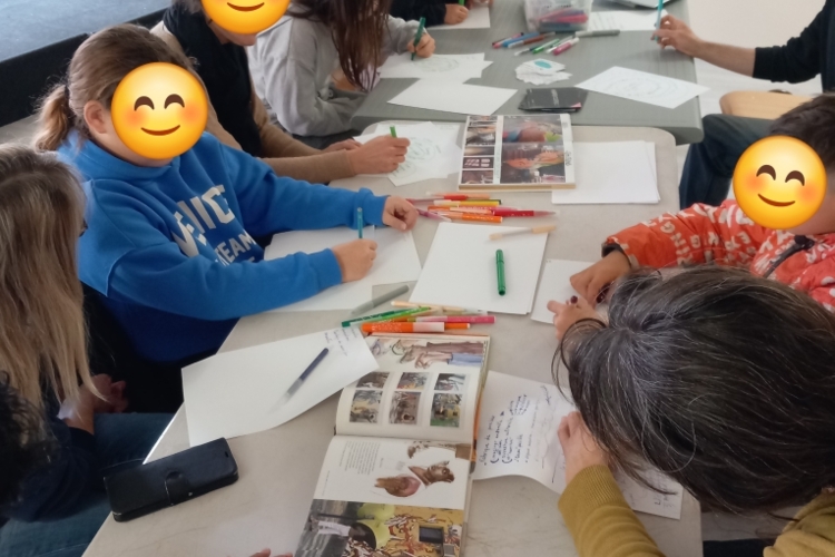 Une meute de loups au clair de lune, un grand arbre de la transmission, des êtres hybrides, sans oublier l’incontournable licorne. Bah oui, forcément ! Puis, de la végétation foisonnante, cachant ici et là des animaux sauvages ! Et des livres, des instruments de musique … bref de quoi suffire pour imaginer trois maquettes qui seront présentées aux habitant.e.s courant Avril. On a hâte !