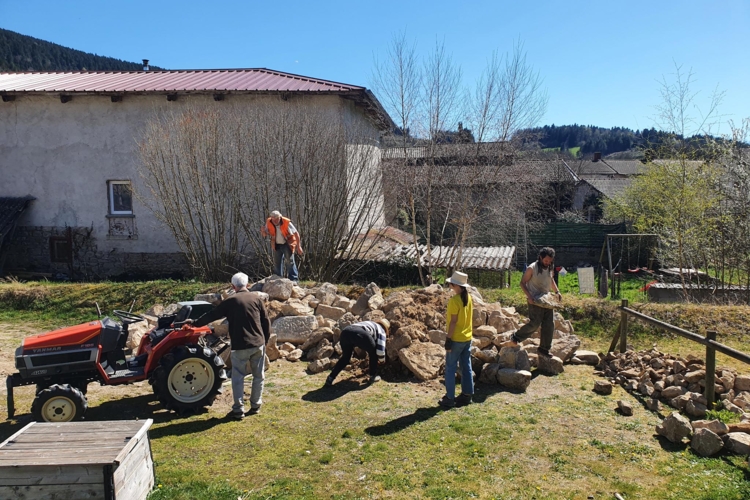 Depuis, 3 sessions de tri de pierres se sont succédées, sans compter une annulation de dernière minute suite à des chutes de neige tardives. Ces sessions de tri sont importantes pour faciliter ensuite la construction du four à pain et de son abri. Outillé·es de baramines, d’un tracteur, de pioches, etc., nous avons séparé les pierres en fonction de leur volume : les pierres de taille (pour les angles des murs), les grosses pierres, les moyennes et les plus petites.